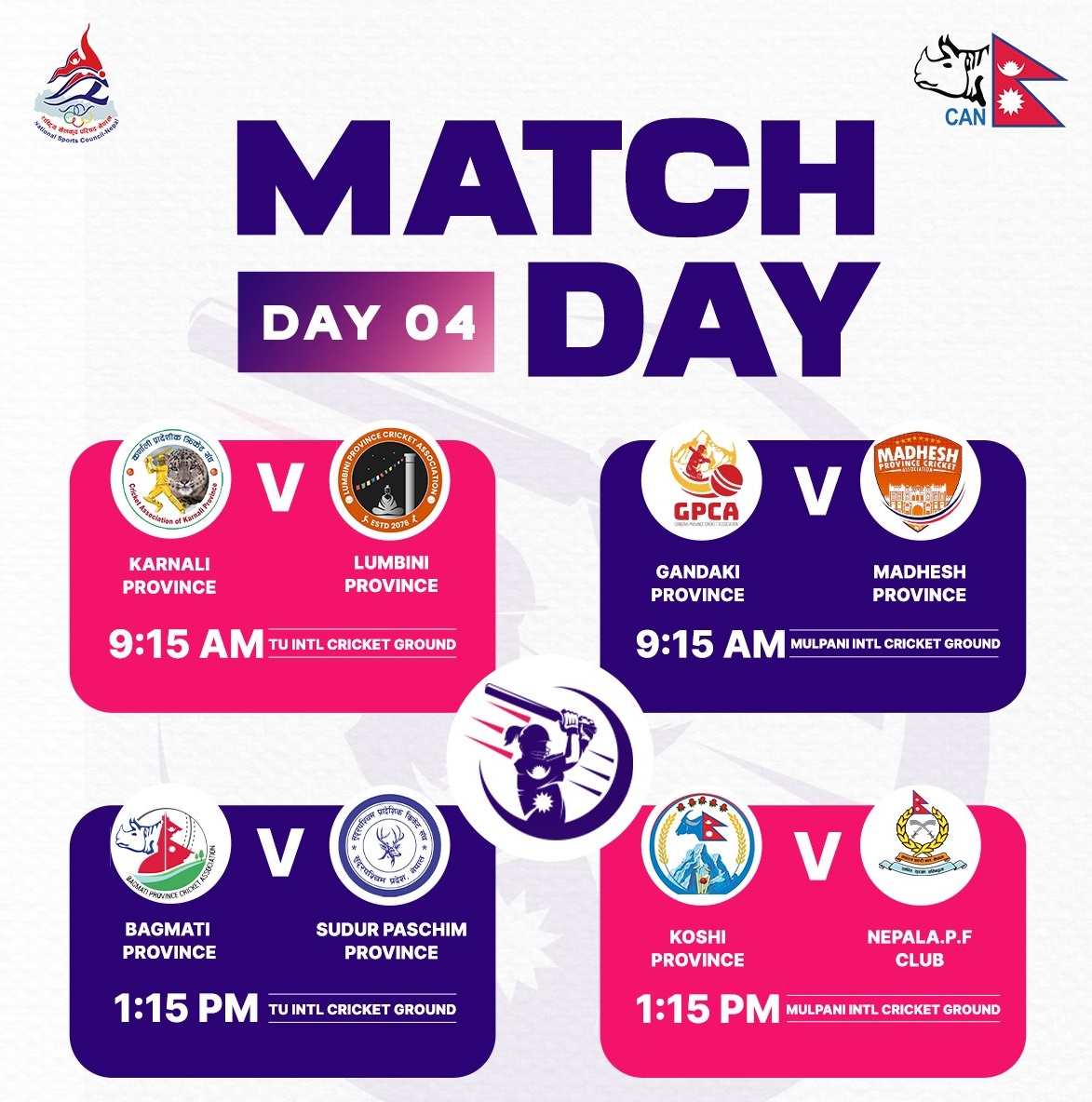 कीर्तिपुरमा अहिले साढे ९ बजे कर्णाली र लुम्बिनी प्रदेश तथा मूलपानीमा गण्डकी र मधेस खेल्दैछन् । त्यस्तै, दिउँसो सवा एक बजे कीर्तिपुरमा बाग्मती र सुदूरपश्चिम तथा मूलपानीमा एपीएफ र कोशी प्रदेशबीच खेल हुनेछ । प्रतियोगितामा सात वटा प्रदेश र नेपाल एपीएफ क्लब सहभागी छन् ।