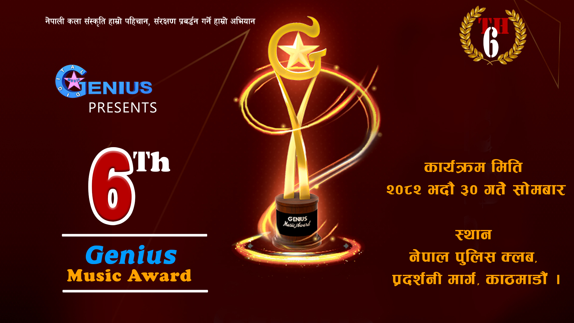 नेपाली गीत सङ्गीतलाई राष्ट्रिय तथा अन्तर्राष्ट्रिय स्तरमा प्रवद्र्धन र कलाकर्मीलाई प्रोत्साहन तथा सम्मानका लागि विभिन्न विधामा ‘छैठौं जिनियस म्युजिक अवार्ड–२०८१’ प्रदान गरिने यस अवार्ड क्रार्यक्रमको उत्कृष्ट पाँच चाडैंनै सार्बजनिक गर्ने तयारीमा रहेको आयोजक कम्पनिले जानाकारी दिएका छन् ।