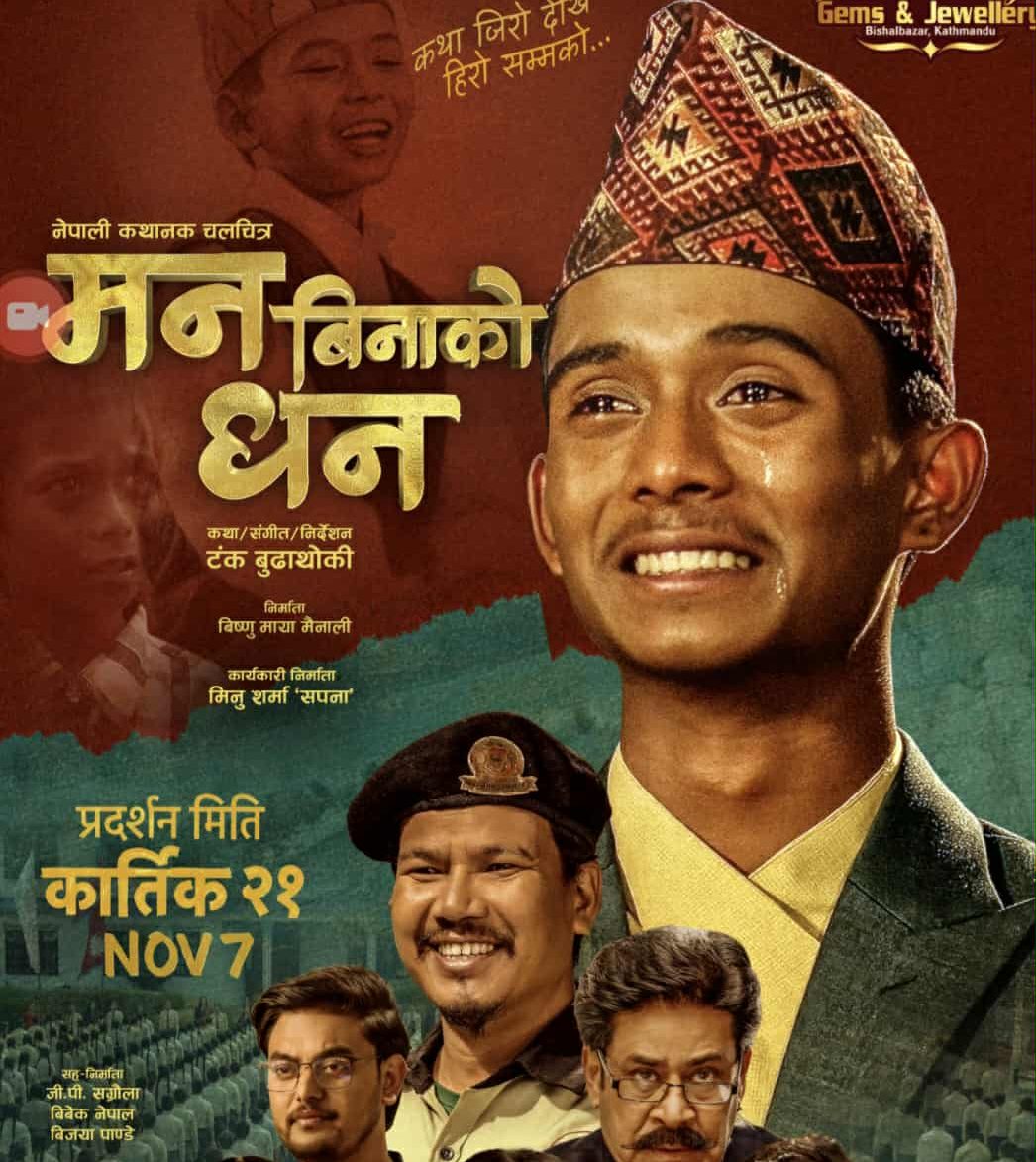 काठमाडौं — बालगायक अशोक दर्जी अभिनीत चलचित्र ‘मन बिनाको धन’ आगामी कार्तिक २१ गतेदेखि देशव्यापी रूपमा प्रदर्शनमा आउँदैछ। निर्देशक तथा संगीतकार टंक बुढाथोकीको कथा, संगीत र निर्देशनमा बनेको यो चलचित्रले मन र धनबीचको सम्बन्धलाई भावनात्मक रूपमा प्रस्तुत गर्ने उद्देश्य राखेको छ।